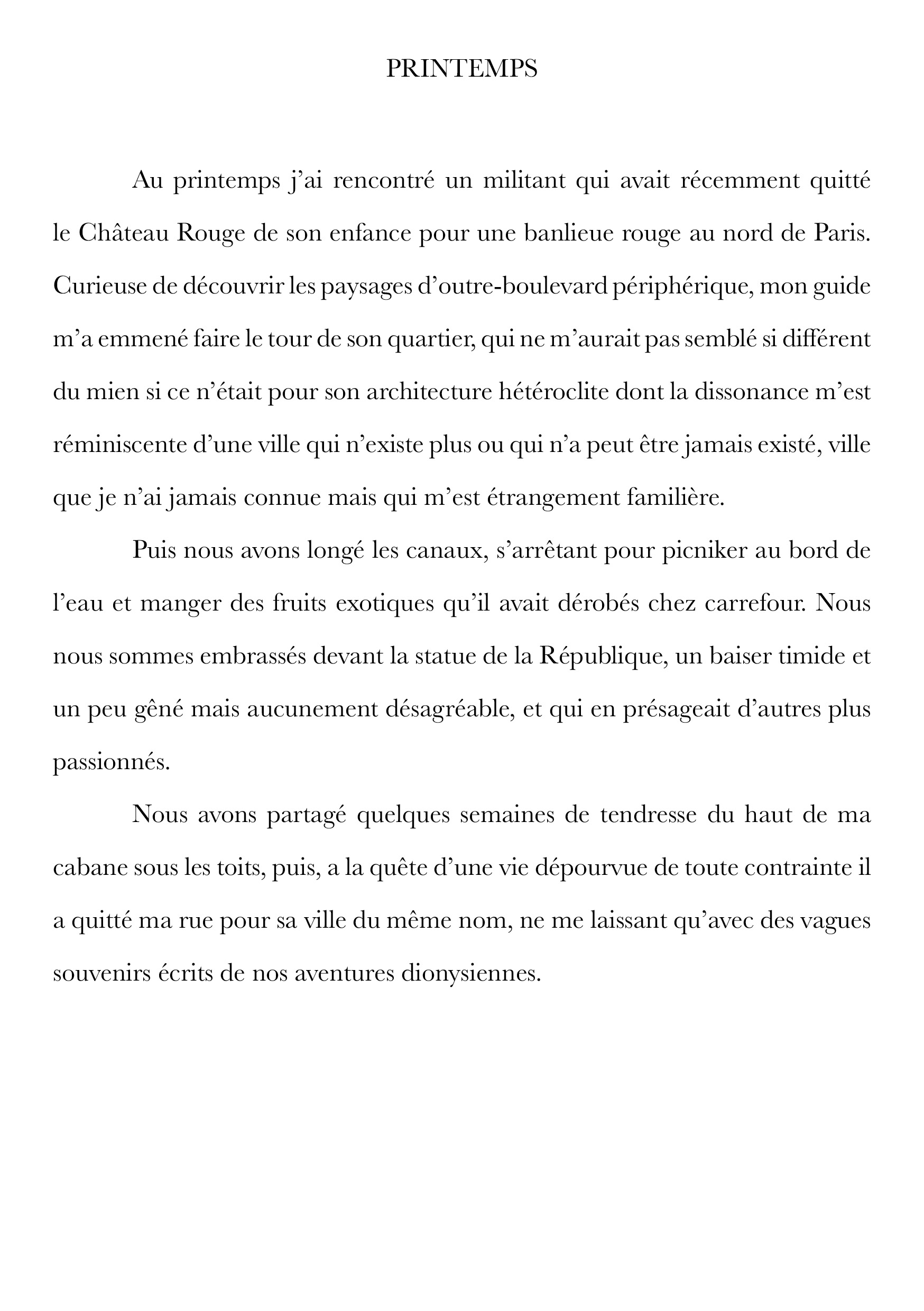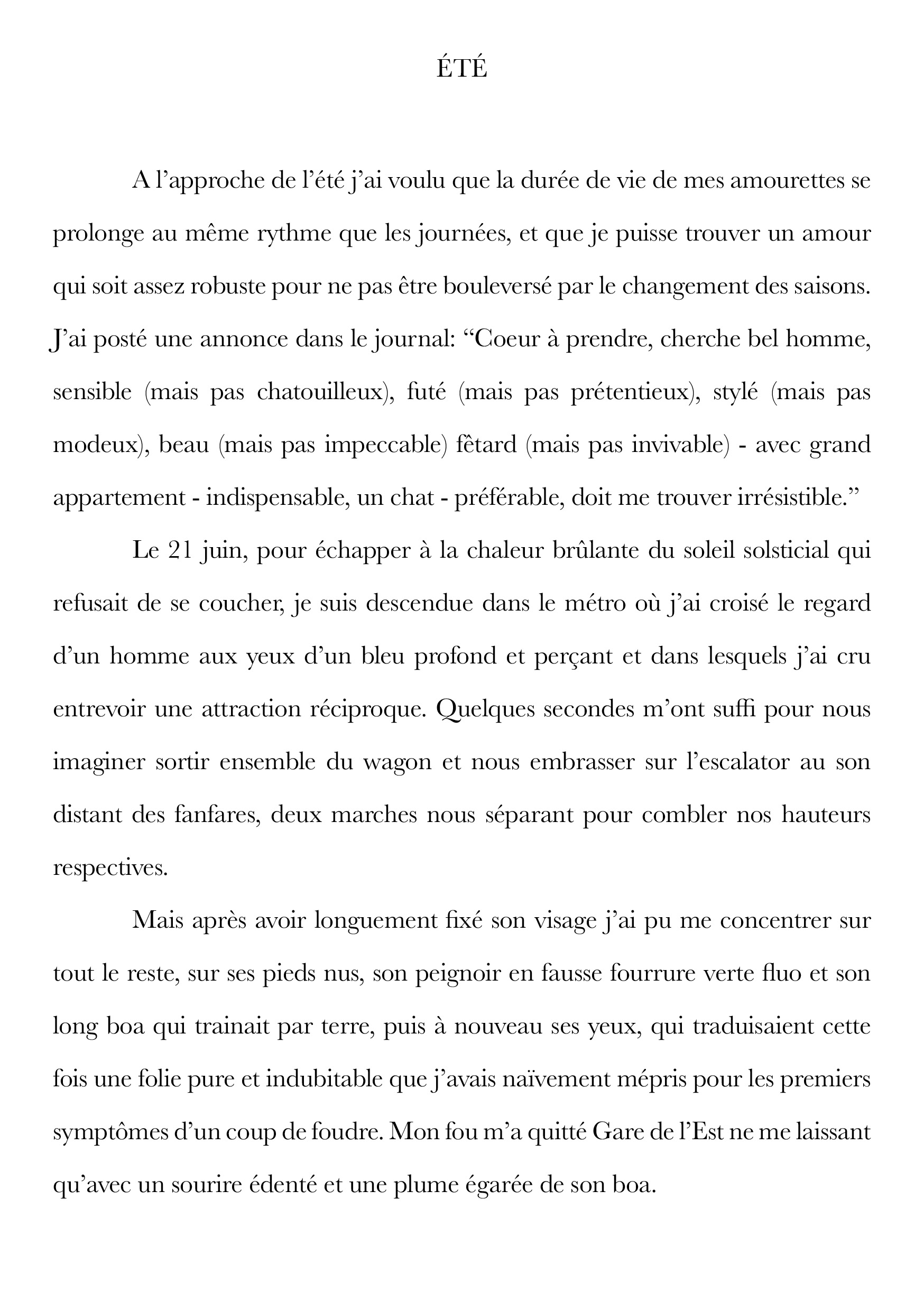 "Contes des quatre saisons" (tales of the four seasons) is an illustrated short story in four parts, inspired by the series of films of the same name by Eric Rohmer. Both the text and the illustrations are the work of Phoebe Eddleston.