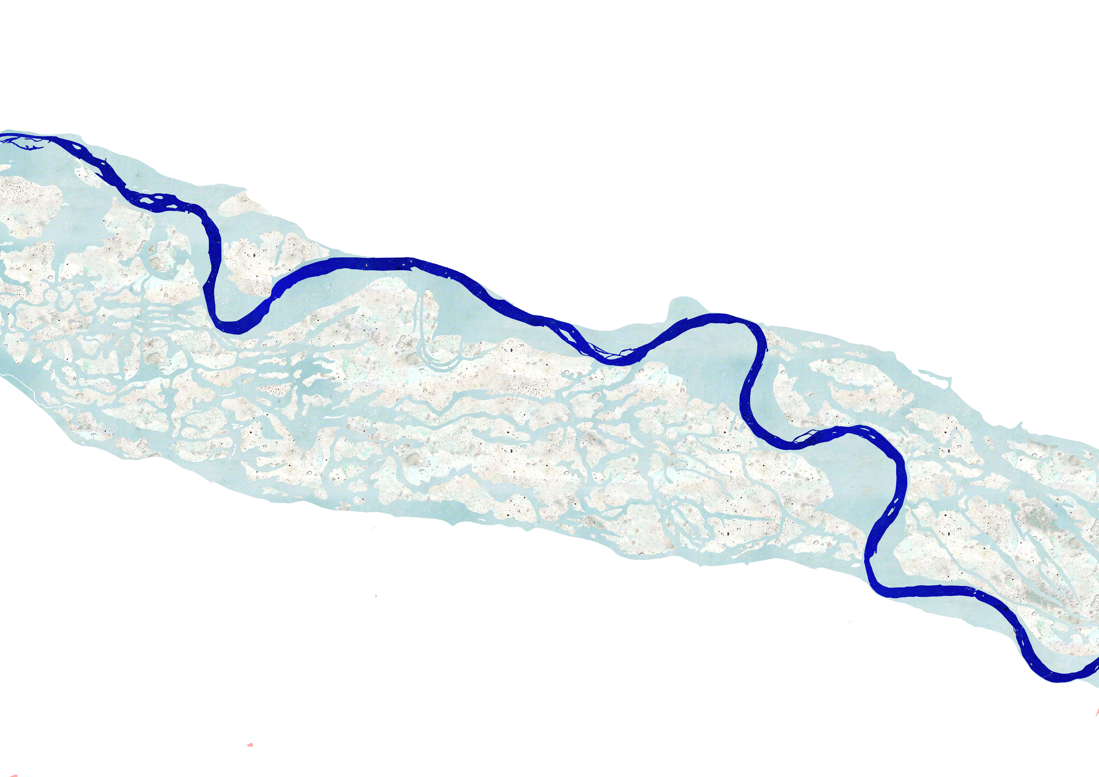 FR: “Riverdance” est une série de cartes inspirées par les cartes des méandres du Mississippi de Harold Fisk (1944) qui retracent les lits du fleuve au cours des millénaires. Dans ma série j’ai choisi de retracer les cours de l’Allier au fil des cinquante dernières années, mais aussi de représenter l’hydrogéologie d’autres cours d’eau français afin de montrer que la surface recouverte d’eau ne représente qu’une petite partie de l’écosystème fluvial, et que ces cours appartiennent à des lits bien plus vastes.